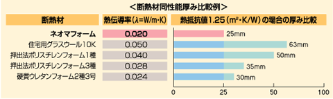 ネオマフォームは他の断熱材と比べて、薄くても優れた断熱性能を発揮できる断熱材です。またその独立気泡率の高さとガスバリア性から極めて経時変化が少なく、長期的な性能でも優れた特性を持っています。